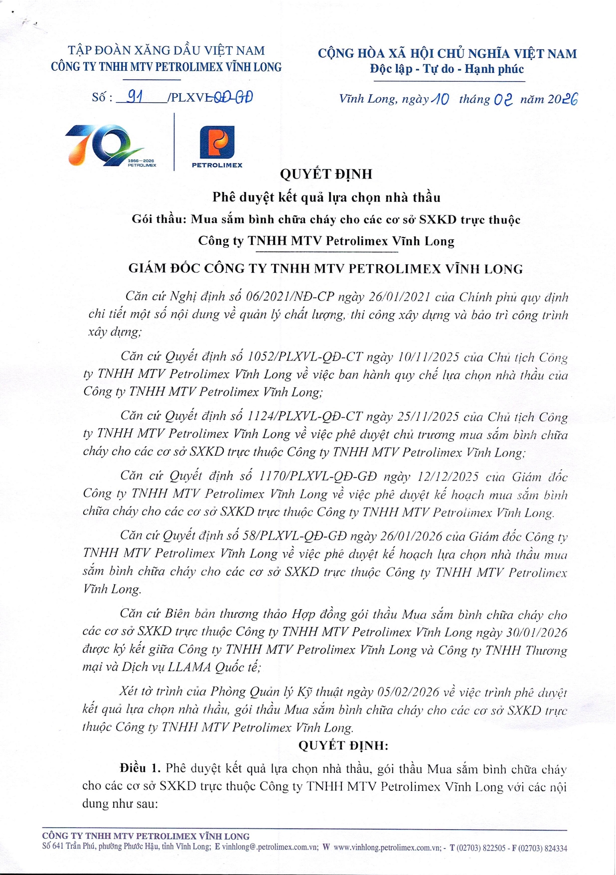 Quyết định phê duyệt kết quả LCNT gói thầu: Mua sắm bình chữa cháy cho các cơ sở SXKD trực thuộc Công ty TNHH MTV Petrolimex Vĩnh Long